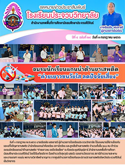 วันที่ ๑ กรกฎาคม พ.ศ.๒๕๖๖ นายเธียรชัย แสงชาตรี ผู้อำนวยการโรงเรียนประจวบวิทยาลัย ได้มอบหมายให้งานป้องกันและแก้ไขปัญหายาเสพติด นำนักเรียนแกนนำห้องเรียน สภานักเรียน และลูกเสือต้านยาเสพติด จำนวนทั้งสิ้น ๒๐๐ คน เข้าร่วมอบรมนักเรียนแกนนำต้านยาเสพติด “ค่ายเยาวชน ลดปัจจัยเสี่ยง” ณ ห้องประชุมหิรัญญิการ์ สำนักงานเขตพื้นที่การศึกษามัธยมศึกษาประจวบคีรีขันธ์ โดยได้รับเกียรติจาก ร้อยตำรวจโทสุขวุฒิ แสงบัว รองสารวัตรจราจร สถานีตำรวจบางสะพาน และนางมณฑา ขนเม่น พยาบาลวิชาชีพชำนาญการ จากศูนย์อำนวยการป้องกันและปราบปรามยาเสพติดจังหวัดประจวบคีรีขันธ์ เป็นวิทยากร